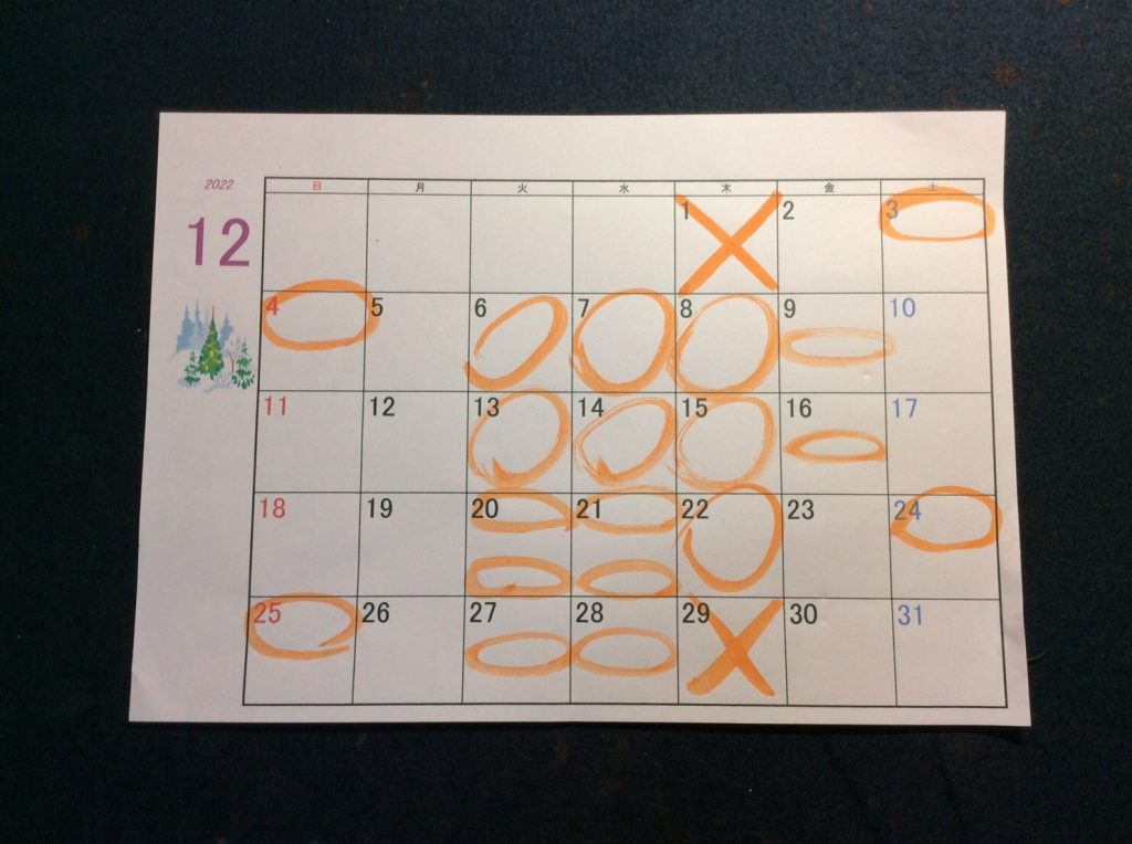おけいこ日/お知らせ 令和4(2022)年12月のお稽古日 2022年11月15日 by rakuyusyo 令和4年(2022)年12月のお稽古日は以下の通りです。 3日(土)、4日(日)、6日(火)、7日(水)、8日(木)、9日(金)、13日(火)、14日(水)、15日(木)、16日(金)、20日(火)、21日(水)、22日(木)、24日(土)、25日(日)、27日(火)、28日(水) Follow me! FacebookXHatenaPocketCopy rakuyusyo