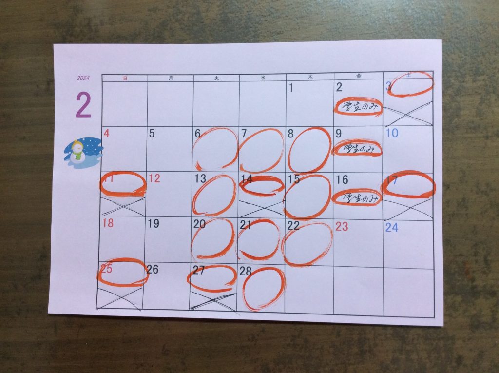 おけいこ日/お知らせ 令和6(2024)年2月のお稽古日 2024年1月15日 by rakuyusyo 令和6年(2024)年2月のお稽古日は以下の通りです。 2日(金)、3日(土)、6日(火)、7日(水)、8日(木)、9日(金)、11日(日・祝)、13日(火)、14日(水)、15日(木)、16日(金)、17日(土)、20日(火)、21日(水)、22日(木)、25日(日)、27日(火)、28日(水) Follow me! FacebookXHatenaPocketCopy rakuyusyo